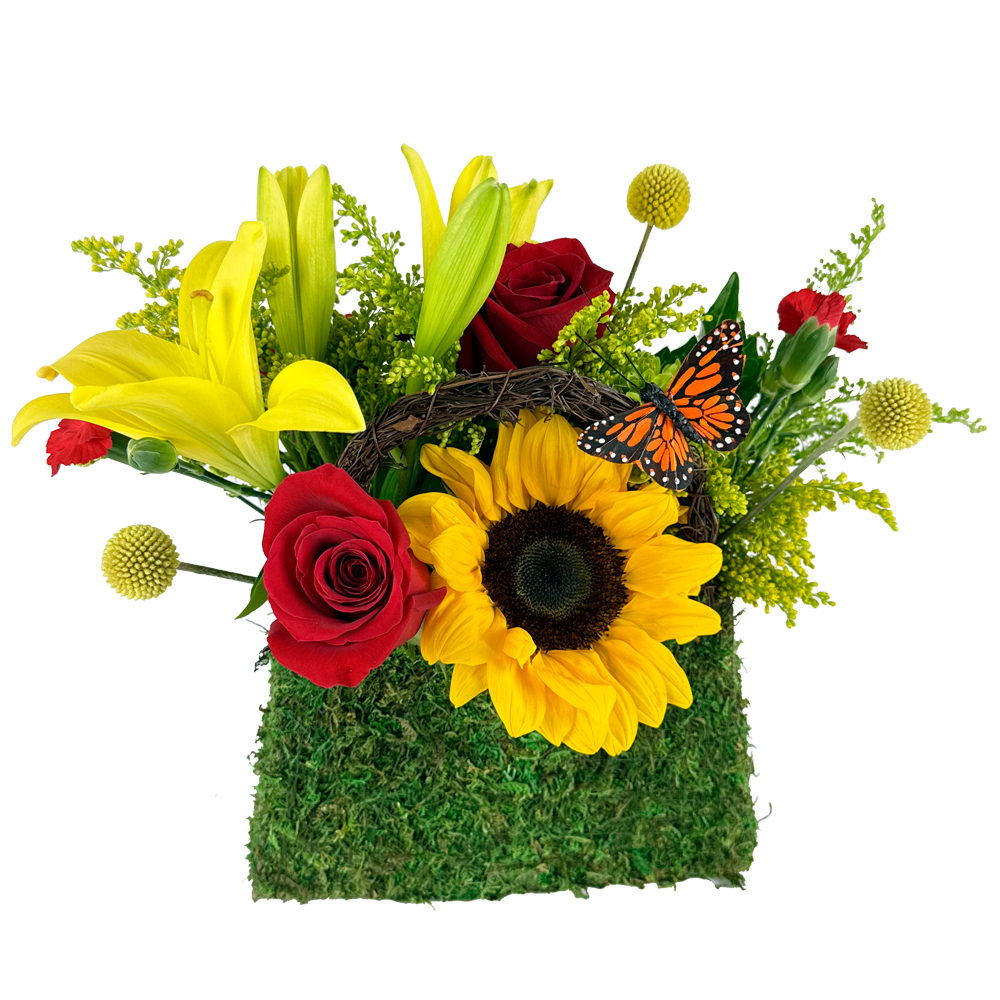 As if borrowed from a secret garden at golden hour, Butterfly Garden is a whimsical blend of sunflowers, roses, lilies, and fresh green textures — finished with a delicate butterfly accent that feels straight out of a fairytale. Bright, playful, and just a little magical, this arrangement is made for sending wonder, smiles, and a touch of flirtatious charm.