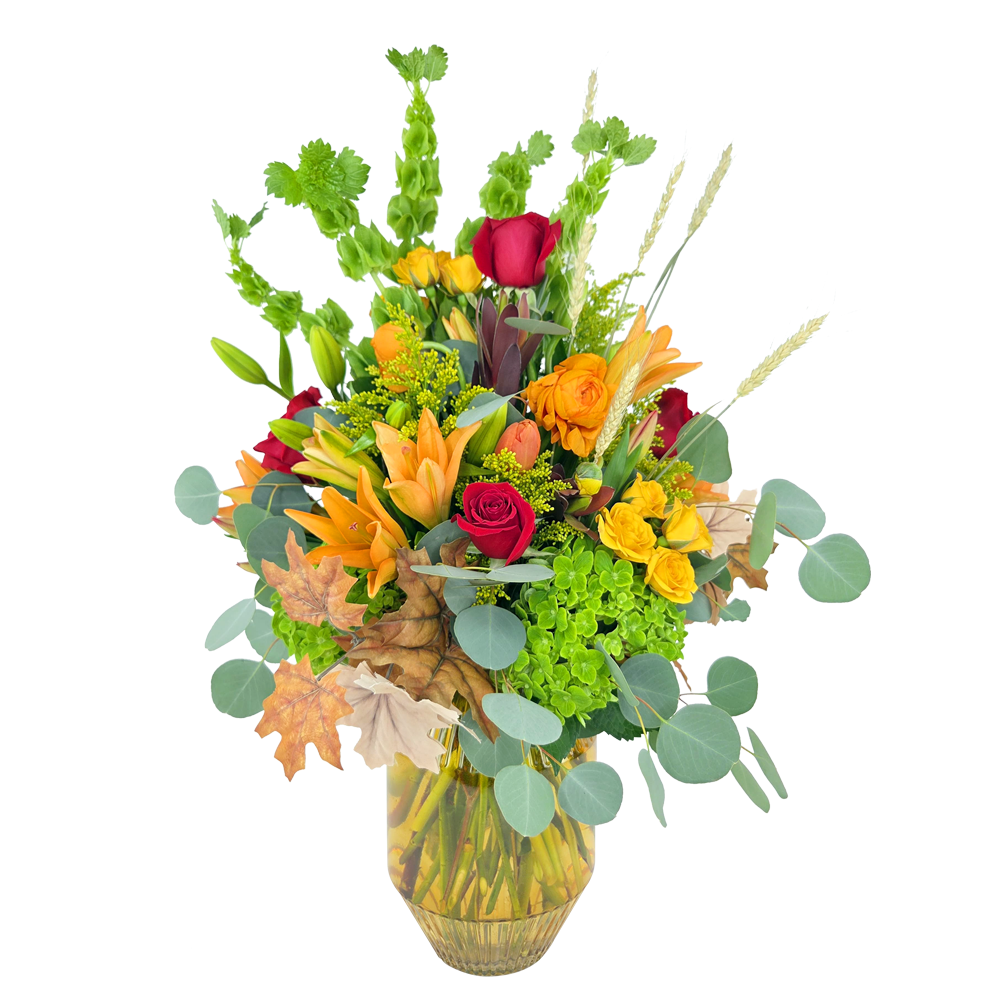 Lush assortment of premium fall flowers in rich autumn hues is gathered into a stunning vase, creating a statement piece that feels both elegant and festive. Perfect for celebrating special occasions, sending as a luxury gift, or making your home feel warm and inviting, this arrangement is worth every bit of the hype.