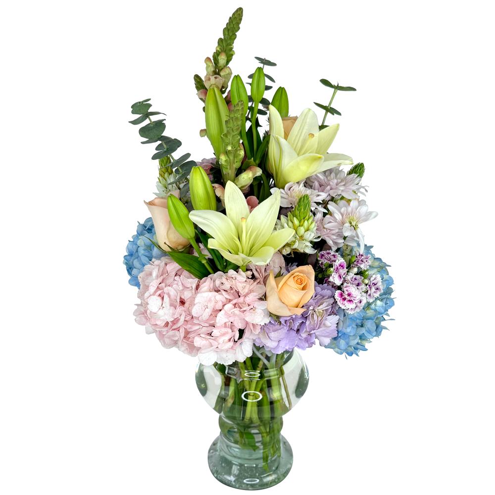 This elegant arrangement features a soft, romantic mix of pastel hydrangeas in blush pink, lavender, and sky blue, highlighted with graceful lily blooms and buds, delicate seasonal flowers, and fresh greenery. Designed in a classic clear glass vase, it’s full, airy, and beautifully balanced—perfect for adding a touch of calm, fresh color to any space.