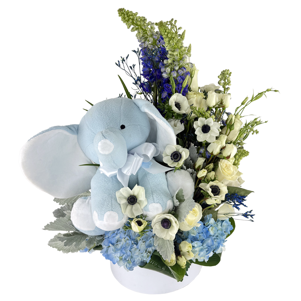 Celebrate the arrival of your precious little boy with the Baby Blue Bliss arrangement, a serene and elegant display of soft blue and white blooms. This tender bouquet features a beautiful mix of blue hydrangeas, white roses, and delicate limonium, creating a calming and peaceful atmosphere to welcome your bundle of joy. The cool blue tones symbolize tranquility and new beginnings, while the pure white flowers represent innocence and love. Whether as a thoughtful gift for new parents or a gentle addition to a nursery, Baby Blue Bliss brings warmth and joy, perfectly capturing the sweet moments of a new arrival. **Flowers are subject to availability.