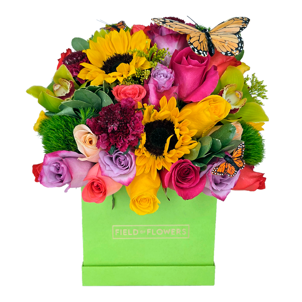 Ready for a contemporary, trending style of floral arrangement? Our “cupola” style may be just the thing! We place a strong plastic liner in a stylish box and then carefully arrange an abundance of flowers to achieve a perfectly symmetrical, cupola shape. Our Beauty in Colors is one variation on that theme. Each arrangement is hand-crafted by a skilled designer and is unique. The one pictured is only an example. The designer making yours will use the most beautiful, freshest flowers available to achieve an arrangement like the one pictured in appearance, size, and value. Approximately 12″H X 11″W.