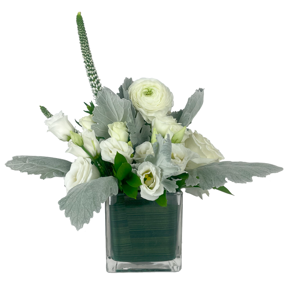 This delicate arrangement captures the serene beauty of winter with snowy white roses, petite blooms, and soft seasonal greenery. Designed in a compact style, it’s perfect for adding a touch of quiet elegance to your holiday décor or as a thoughtful gift for someone who loves timeless simplicity. A little moment of frosty charm!