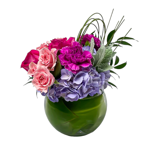 Beautiful pastel combination of flowers to make the perfect decor or gift. A green leaf is placed in the water to surround the vase and cover the stems, giving it an elegant and timeless look. Indulge in the beauty of flowers with this special mix.