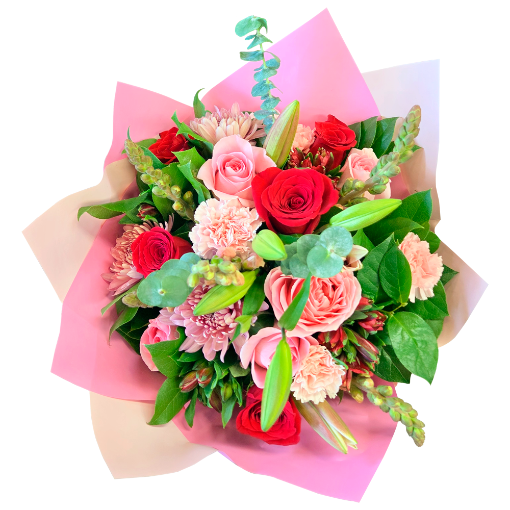 Romantic and beautifully balanced, Blush & Ruby Bouquet features a lush mix of red and pink roses nestled among soft pink carnations, seasonal blooms, and fresh greenery. Finished in elegant blush wrapping with textured accents and buds for height and movement, this bouquet feels classic yet modern—perfect for anniversaries, birthdays, or just because.