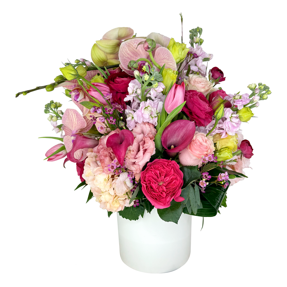 Blushing Garden is a lush, romantic arrangement bursting with soft pinks, creamy whites, and fresh spring greens, designed in a modern white vase. Featuring premium blooms like orchids, tulips, ranunculus, and seasonal accent flowers, this garden-style design is full of texture, movement, and elegant charm. Delicate pastel tones and layered blooms create a dreamy, “just-picked” look that feels fresh, feminine, and timeless.