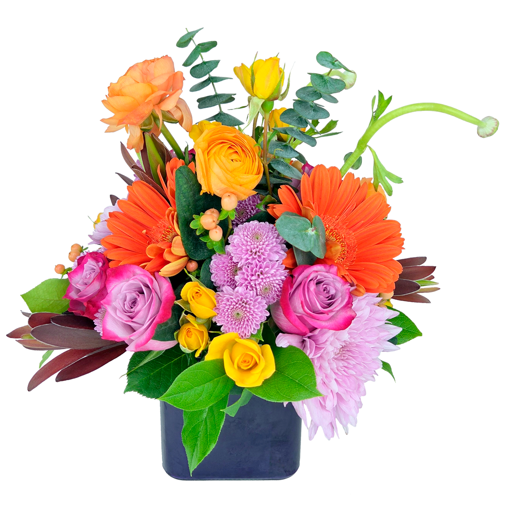 Turn up the happy! Color Splash is a vibrant mix of seasonal blooms in a sleek cube—think citrusy roses, sunny ranunculus, bold gerbera, playful mums, and fresh greenery. Designed with rich, saturated color and lively texture for instant wow.