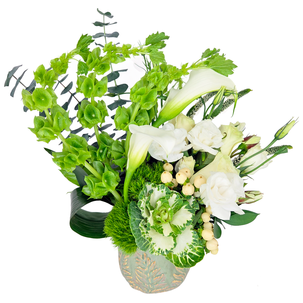 A floral blessing in bloom — Lucky Charm combines calming whites and fresh greens with calla lilies, bells of Ireland, and soft lisianthus to symbolize peace, protection, and renewal. Perfect for healing, encouragement, or sending good energy to someone you care about. Available for delivery throughout Davie, Boca Raton, and South Florida.