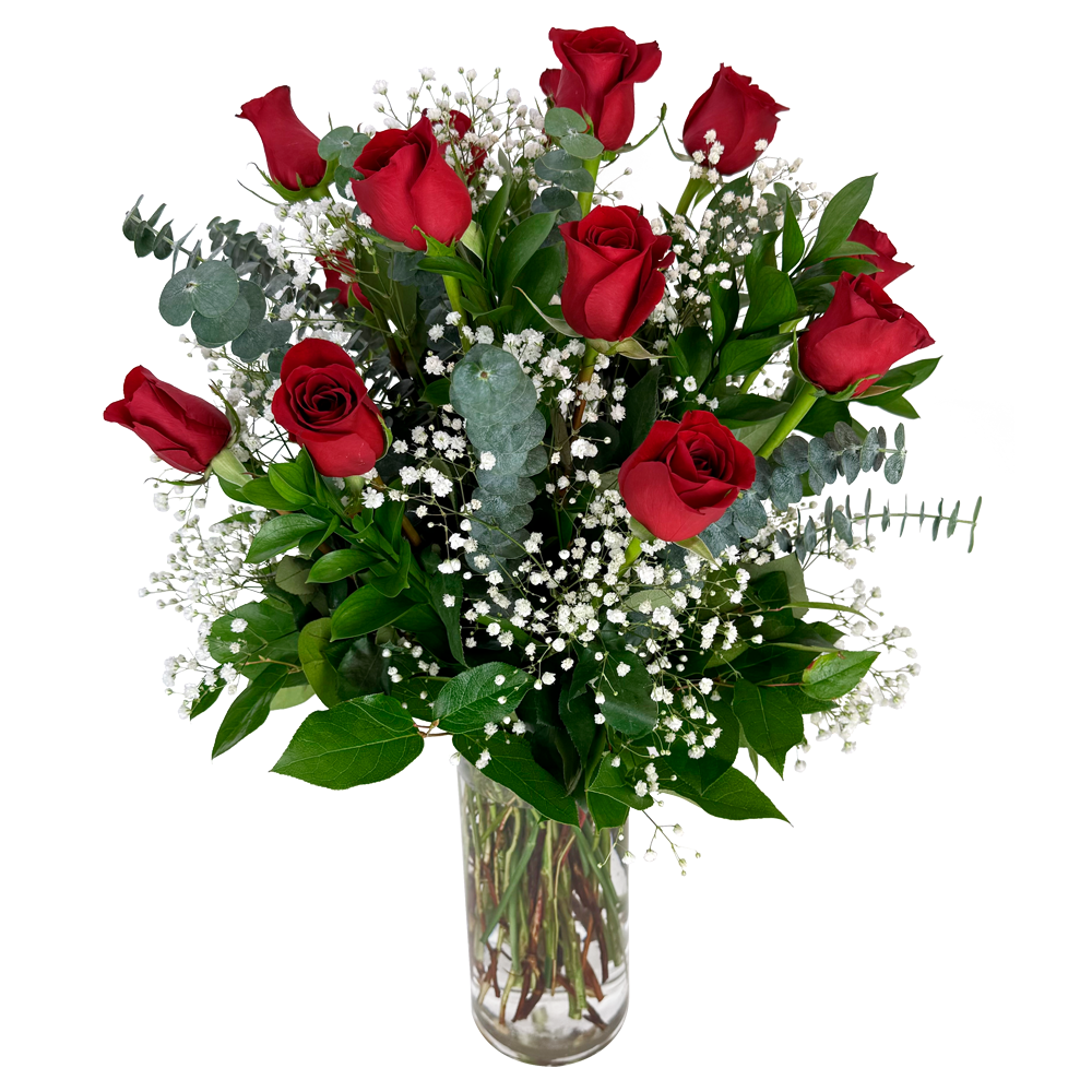 1 Dozen Extra-Long Red Roses is the ultimate classic for Valentine’s Day—bold, timeless, and unforgettable. Featuring 12 premium extra-long stem red roses, this arrangement is elegantly styled with delicate baby’s breath, fresh eucalyptus, and lush greenery in a tall, clear glass vase for a clean, romantic presentation.