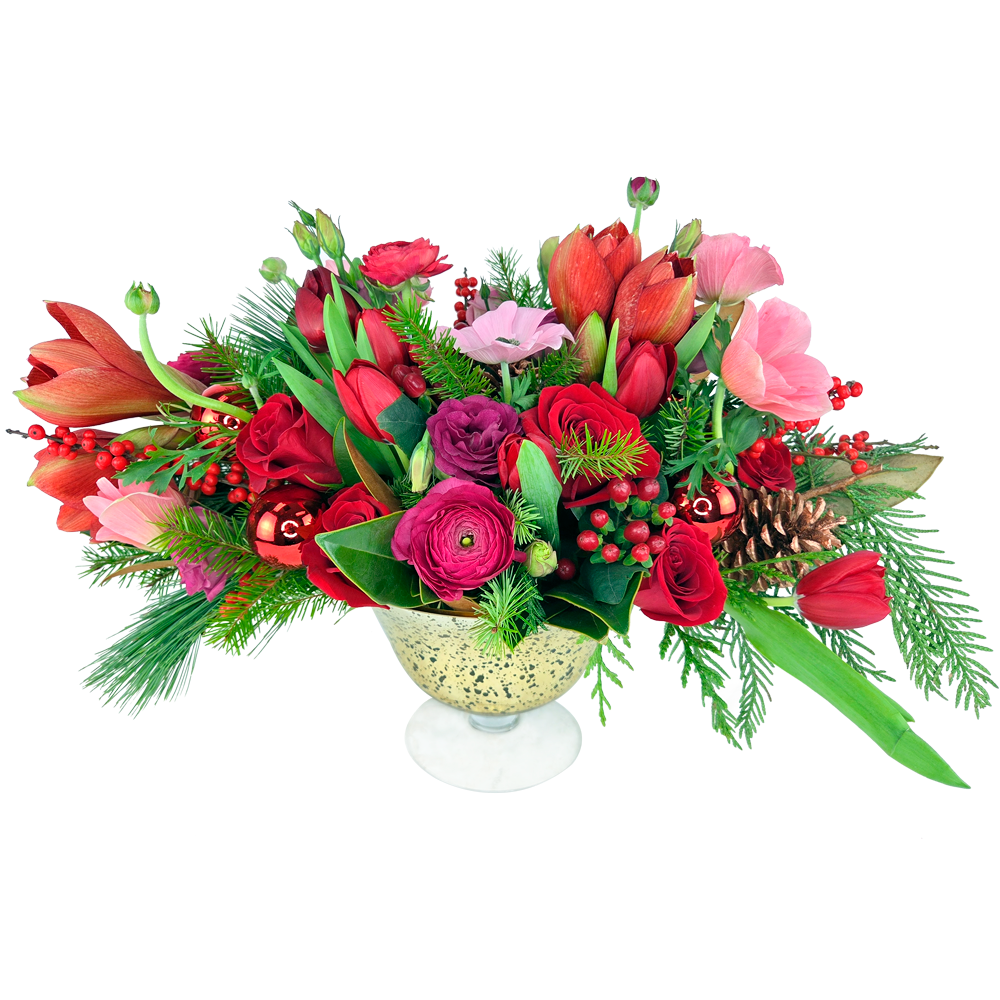 A deluxe centerpiece bursting with rich color and texture, designed to make a statement. Featuring seasonal blooms in reds and pinks (including roses and coordinating flowers), it’s accented with festive touches like red berries, natural pinecone, and fresh evergreen foliage, all arranged in an elegant compote-style vase. Perfect for celebrations, holiday tables, or a sophisticated gift.