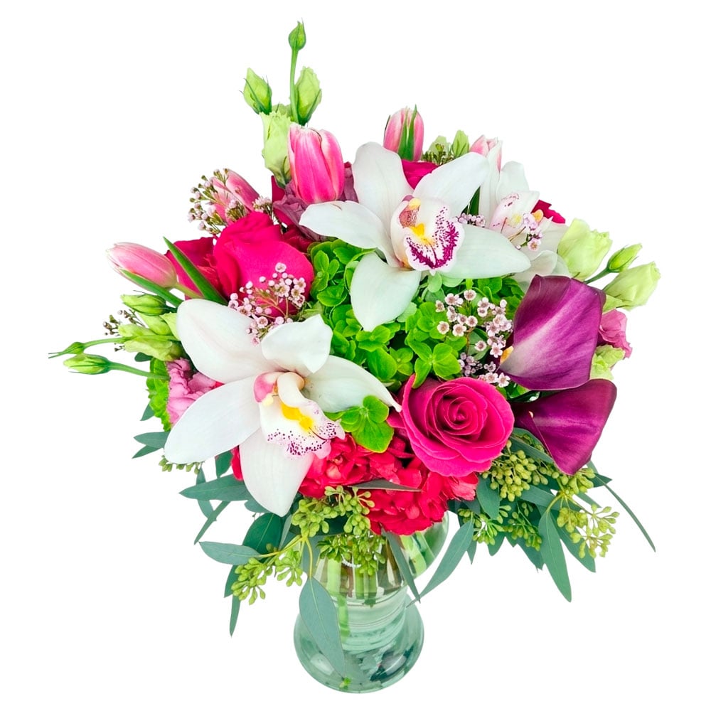 Gratitude is a heartfelt Mother’s Day arrangement designed to say “thank you” in the most beautiful way. Featuring elegant white cymbidium orchids, vibrant pink roses, rich purple calla lilies, and fresh seasonal blooms with lush greenery, this design is arranged in a clear glass vase for a classic, timeless look. Full of color, texture, and love, it’s the perfect gift to celebrate everything Mom does.