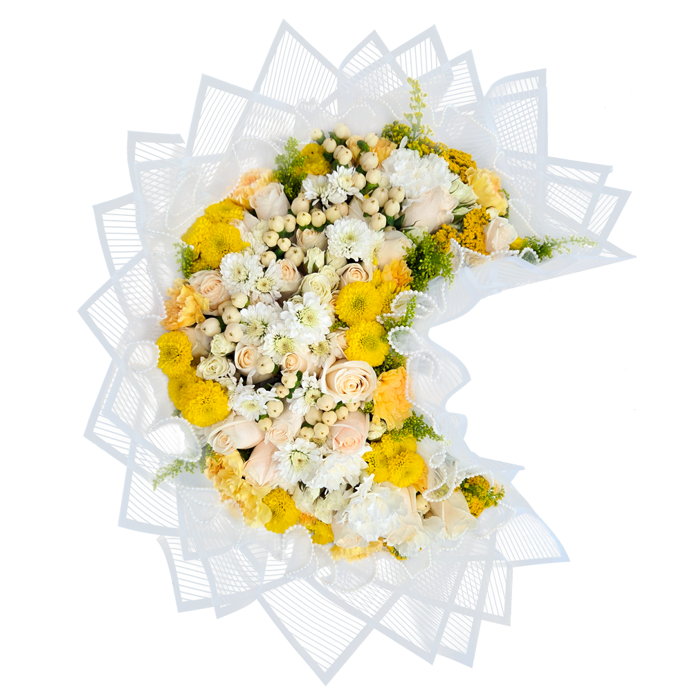 A striking crescent-shaped bouquet that feels mystical and refined, combining white and golden-yellow blooms in a graceful curve. Inspired by autumn nights and the enchanting spirit of October, it carries a subtle Halloween allure while staying elegant and timeless. It’s a one-of-a-kind way to make the season feel extraordinary.