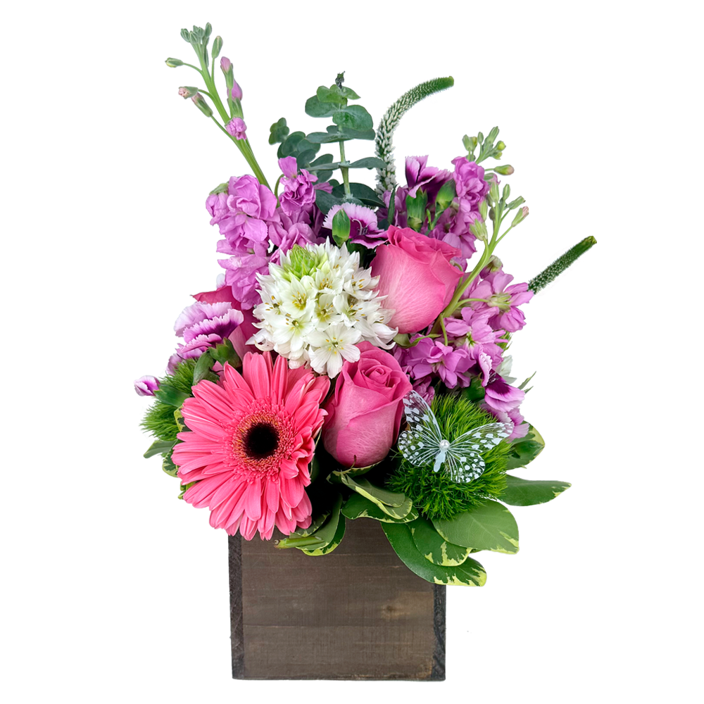 Pretty pinks and soft purples come together in this sweet blend of gerberas, roses, and fresh spring textures. Designed in a rustic wooden box and finished with a delicate butterfly accent, it’s the kind of gift that instantly makes someone smile.