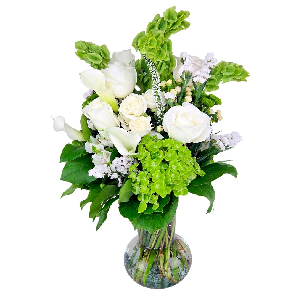 Lucky Blooms is a fresh, elegant arrangement featuring a crisp blend of white blooms and vibrant green accents for a clean, uplifting look. Designed in a clear glass vase, it includes premium flowers like white roses and calla lilies, paired with lush seasonal greens (such as green hydrangea) and delicate textural stems for a modern garden feel.