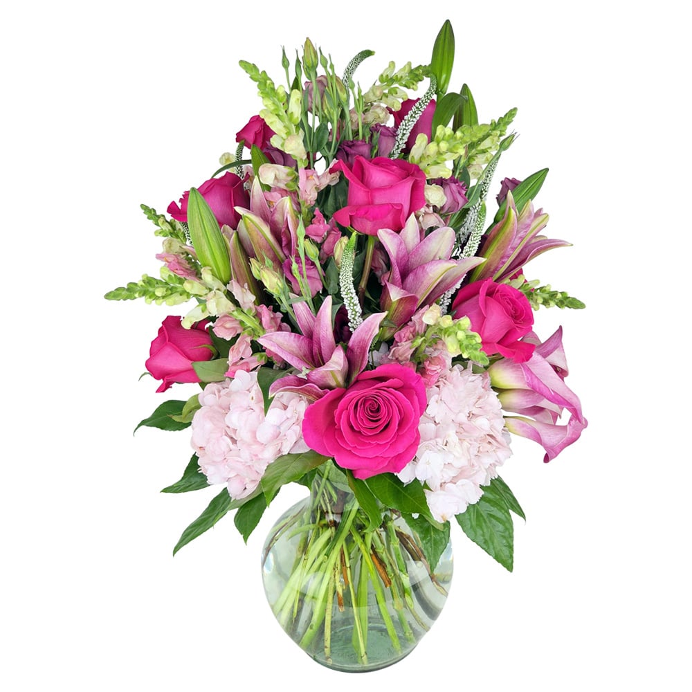 A joyful and substantial mix of bright pinks and soft blush tones, this arrangement is all about celebrating love, warmth, and everything she does. Featuring roses, lilies, hydrangea, and seasonal accents, it’s full, fresh, and effortlessly beautiful in a classic glass vase.