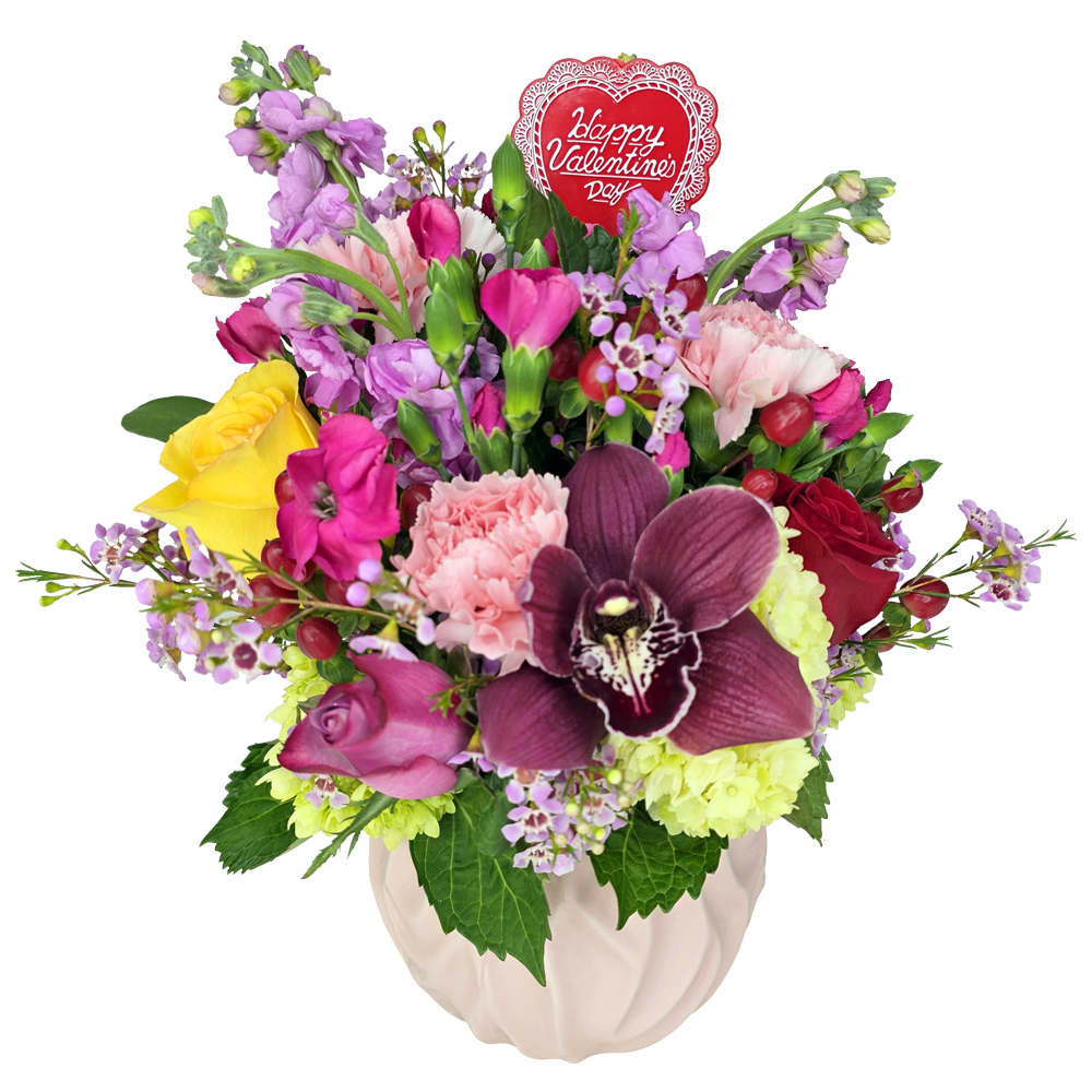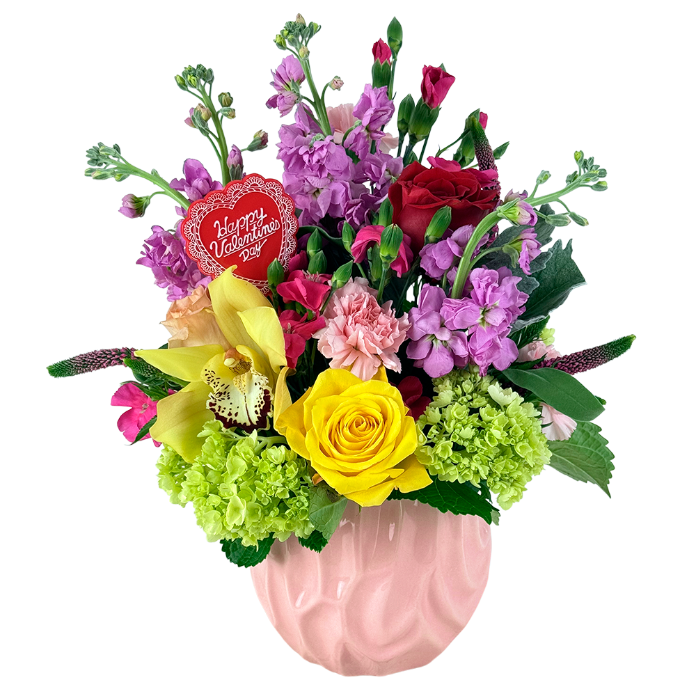 A joyful blend of vibrant roses, seasonal blooms, and lush greenery designed to feel cheerful and full of heart. Colors and flowers may vary, but the overall look, feel, and romantic concept will remain the same. Perfect for celebrating love!