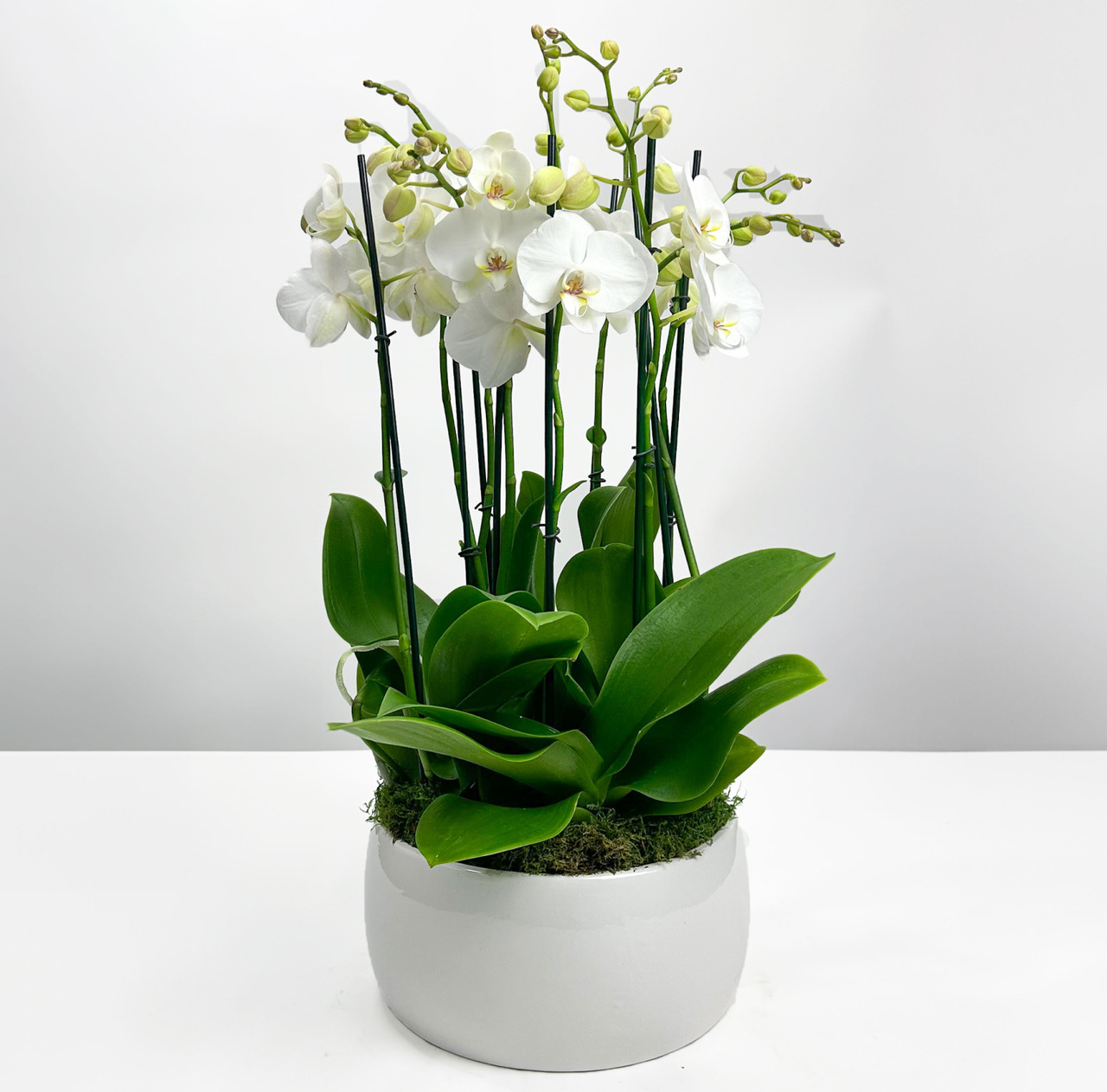An orchid-lover’s delight! This garden includes several orchid plants with multiple flower spikes and dozens of flowers. There are hundreds of orchid varieties, and no two are exactly the same color. Each plant arrangement is hand-crafted by a skilled designer and is unique. The one pictured is only an example. The designer making yours will use the most beautiful plants available to achieve an arrangement similar to the one pictured in appearance, size, and value. The flower buds will open over a period of weeks or even months.