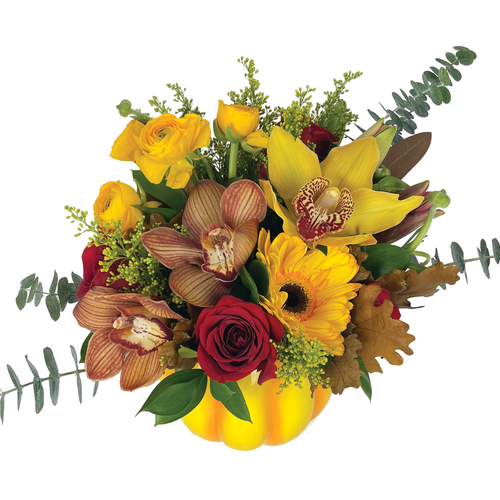 The absolute cutest—a dreamy mix of cymbidium blooms, fluffy ranunculus, delicate roses, and cheerful gerbera daisies, all cozied up in an actual pumpkin vase! It’s a fall fantasy brought to life, perfect for making Thanksgiving tables sparkle or gifting a bundle of autumnal joy.