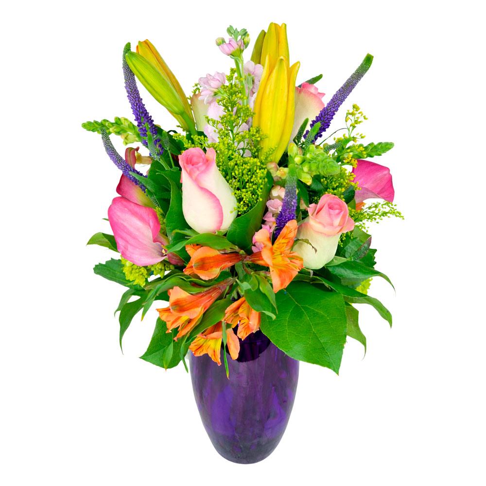 This vibrant, uplifting arrangement features a cheerful mix of pink roses, bold lily buds, and colorful seasonal blooms accented with fresh greens and textured stems. Designed in a striking purple glass vase, it has a lively, modern look with height, movement, and plenty of personality—perfect for making any day feel like a celebration.