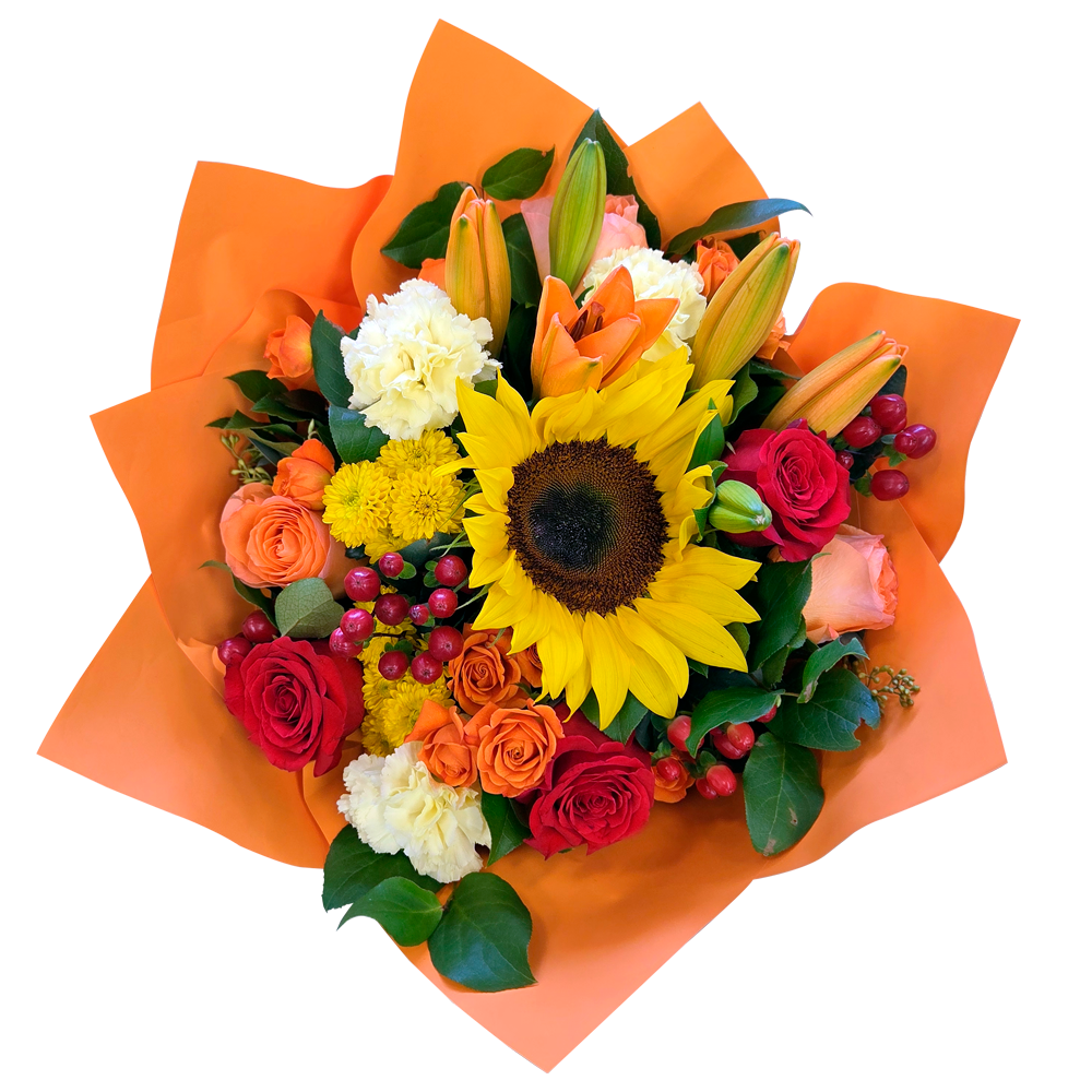 Bright, cheerful, and full of color, Sunny Citrus Burst is a vibrant hand-tied bouquet featuring a radiant sunflower at the center, surrounded by orange and red roses, golden mums, creamy carnations, and fresh seasonal accents like lily buds and hypericum berries. Wrapped in bold orange paper, this bouquet brings instant warmth and joy—perfect for birthdays, congratulations, get well wishes, thank-you gifts, or just because.