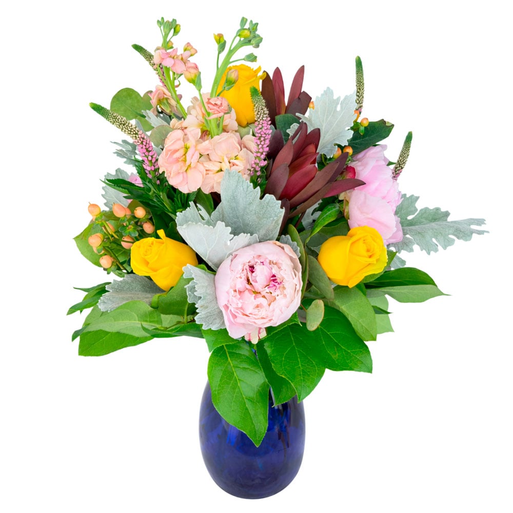 A dreamy, garden-fresh blend of blush pink peonies and sunny yellow roses, softened by delicate peach stock and touched with the moody richness of deep burgundy protea. Silvery dusty miller leaves add a whimsical, textural contrast, while peach hypericum berries and wispy veronica bring playful detail and effortless charm throughout.