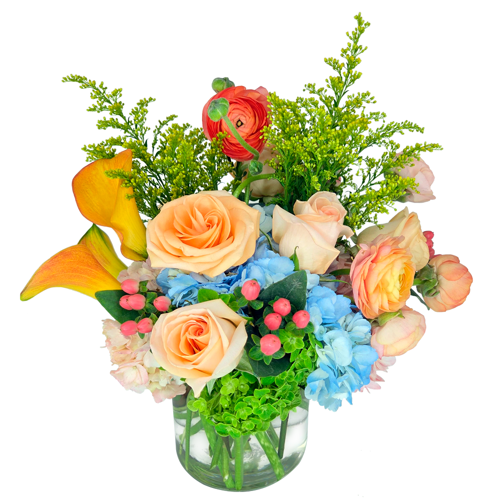 This bright arrangement features a cheerful mix of peach roses, vibrant blue and green hydrangea, and warm seasonal accents like orange calla lilies and a playful pop of ranunculus. Finished with fresh greenery and berry details in a clear glass vase, it’s full of color, texture, and happy energy—perfect for making any day feel special.