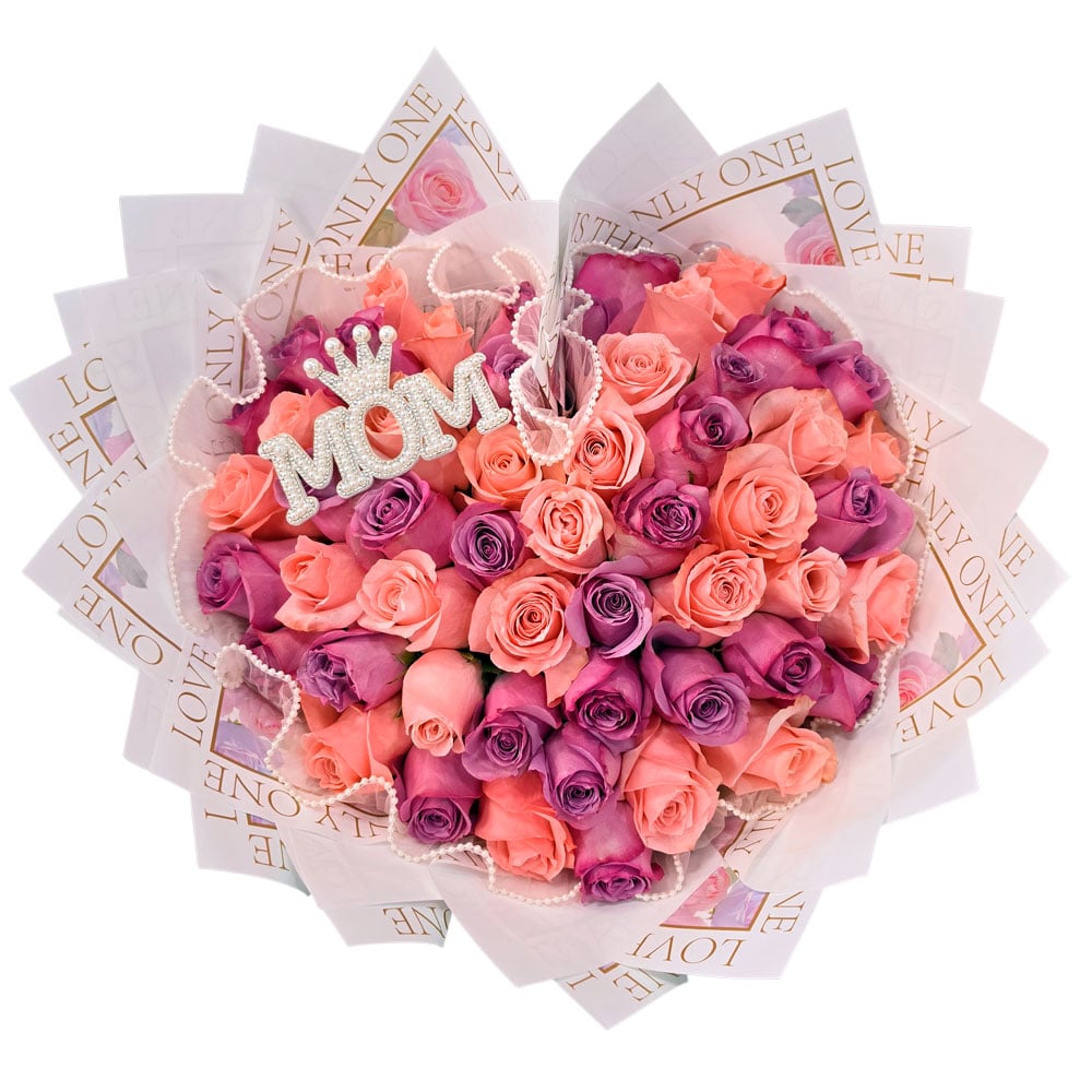 Timeless Love Buchón is a show-stopping Mother’s Day bouquet made to celebrate Mom in the most unforgettable way. Featuring an abundant mix of premium peach and lavender roses, this luxurious buchón is wrapped in elegant designer paper and finished with a sparkling “MOM” accent for the perfect tribute. Bold, romantic, and beautifully full, it’s a statement gift that says “thank you for everything” at first glance.