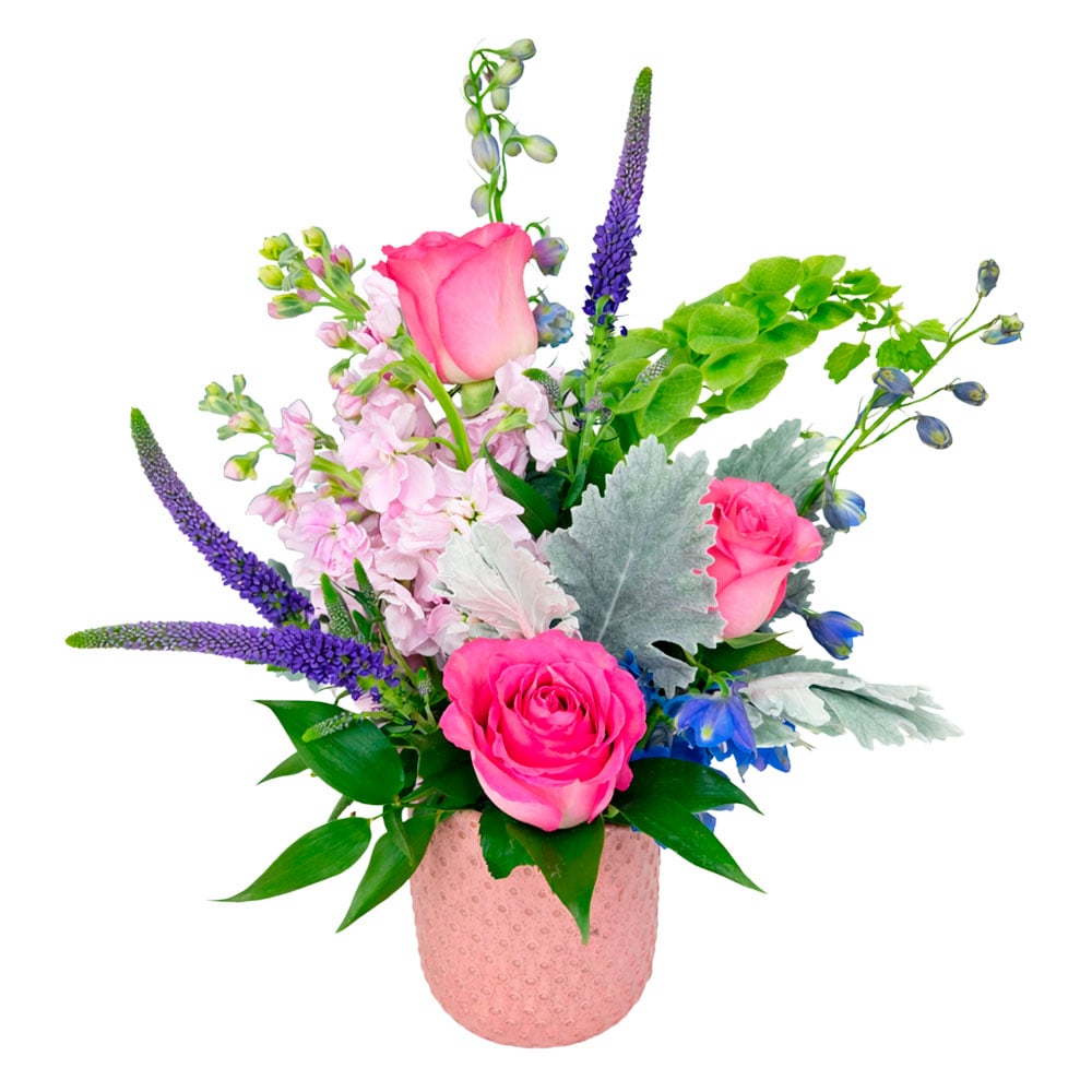 This vibrant, garden-style arrangement pairs romantic hot pink roses with soft seasonal blooms in blush and lavender tones, finished with striking purple accents and fresh greenery for height and texture. Designed in a charming pink ceramic vase, it’s a playful yet elegant piece that brings color, movement, and modern flair to any space.