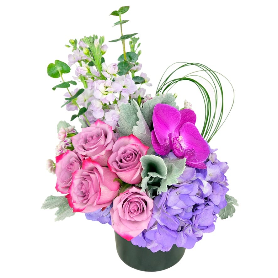 Soft lavender roses, vibrant purple orchid, and fluffy hydrangea with fresh greens—an elegant arrangement that feels calm, romantic, and unforgettable.