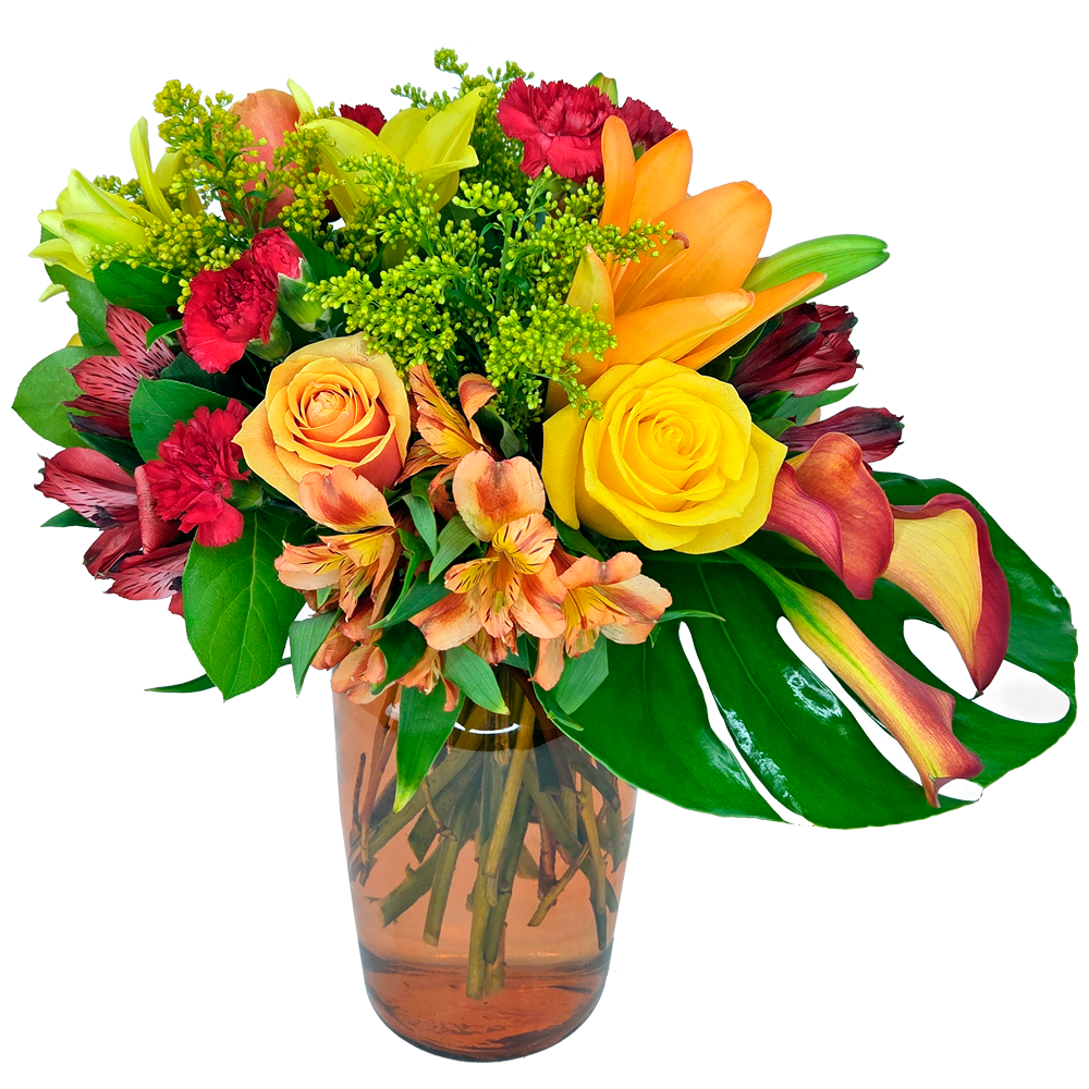 A rich blend of golden yellows, amber oranges, and deep reds, Autumn Tease captures the warmth of fall in a modern glass vase. With roses, lilies, and tropical touches styled around a lush monstera leaf, it’s bold yet inviting — perfect for celebrating the season, thanking a host, or sending a cozy surprise. Available for delivery across Davie, Boca Raton, and South Florida. Fall vibes, delivered.