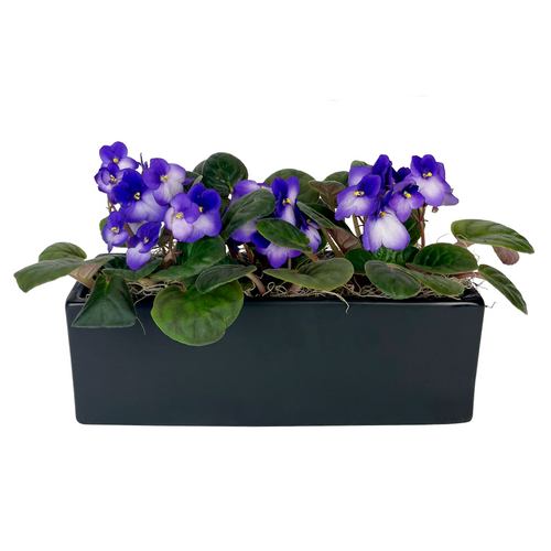 This elegant arrangement features the vibrant charm of three African violets, gracefully nestled in a sleek, rectangular ceramic vase. The soft, colorful blooms contrast beautifully against the clean, minimalist lines of the vase, creating a sophisticated yet effortless look. Perfect for any space, this arrangement brings a pop of color and a touch of tranquility, whether on a desk, windowsill, or coffee table. With its understated beauty and timeless appeal, this piece is sure to brighten your day and your décor.