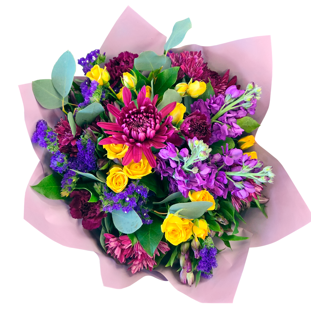 Bold, bright, and full of personality, Violet Sunshine is a vibrant bouquet featuring rich purple blooms and a striking focal flower, accented with cheerful yellow spray roses, textured seasonal flowers, and soft eucalyptus greenery. Wrapped in elegant blush paper, this bouquet delivers the perfect mix of dramatic color and sunny warmth—ideal for birthdays, congratulations, thank-you gifts, or to brighten someone’s day.